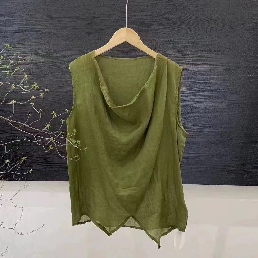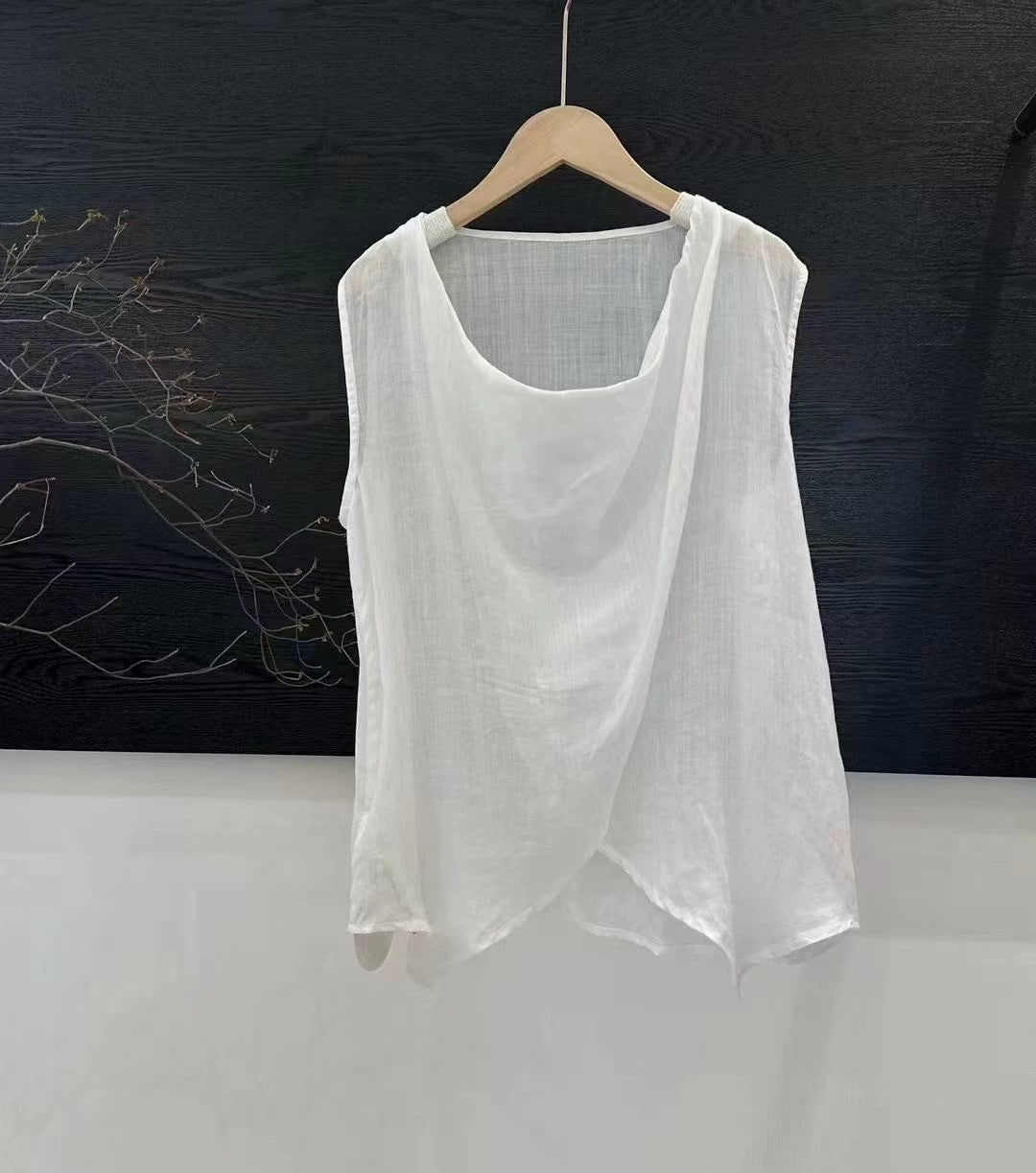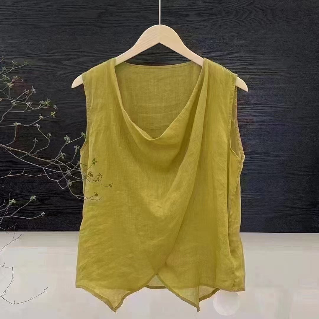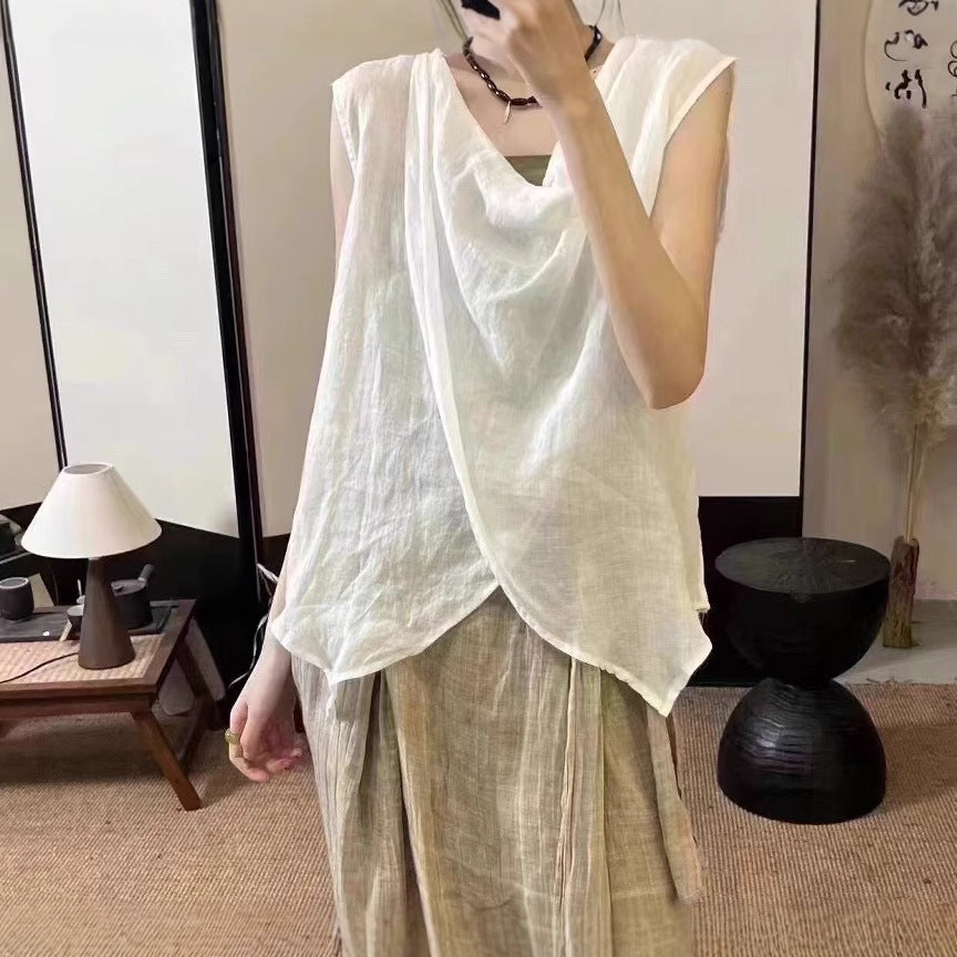 Giv dit hverdagslook med denne ærmeløse, draperede linnedtop et præg af raffinement, hvor komfort møder høj mode i et enkelt stykke.