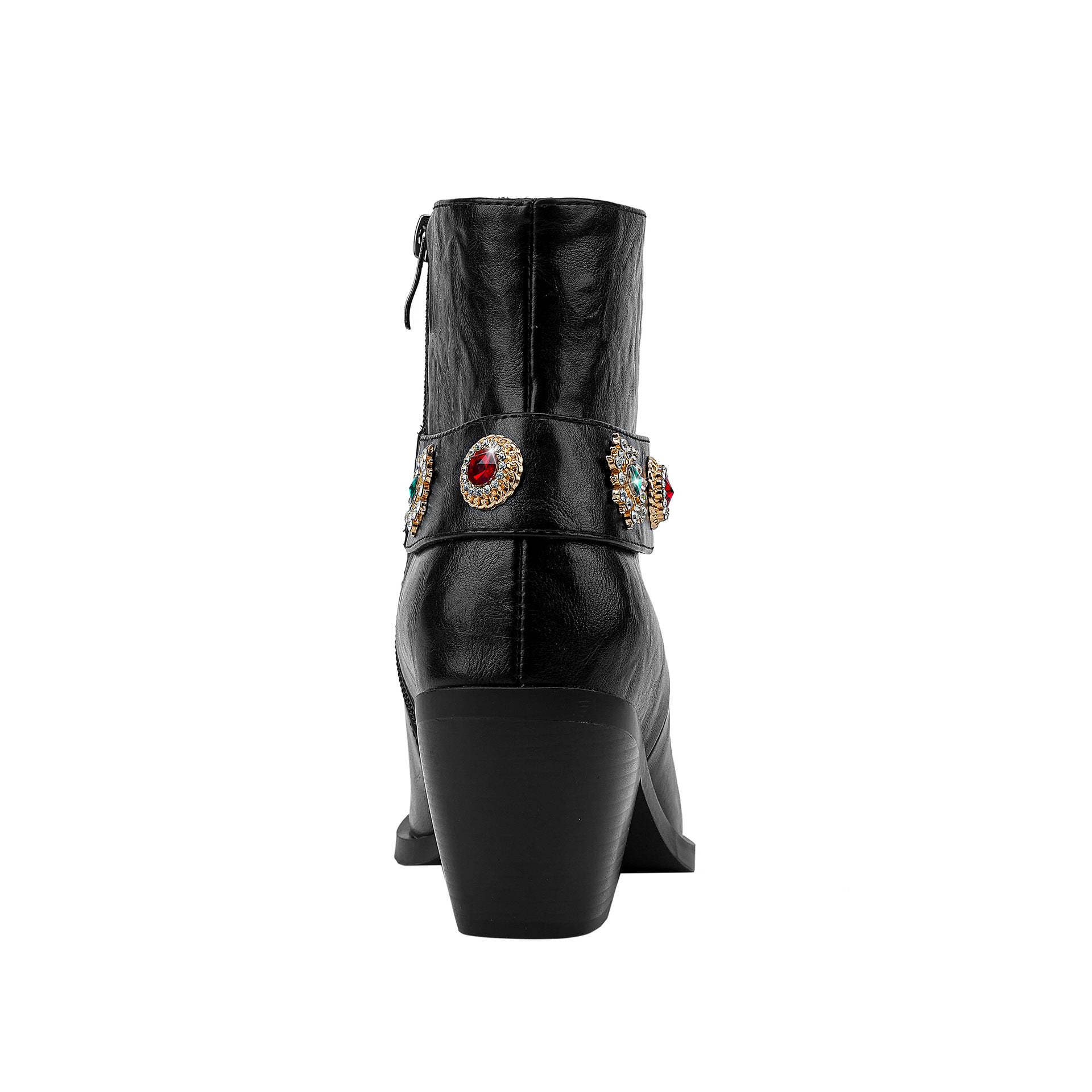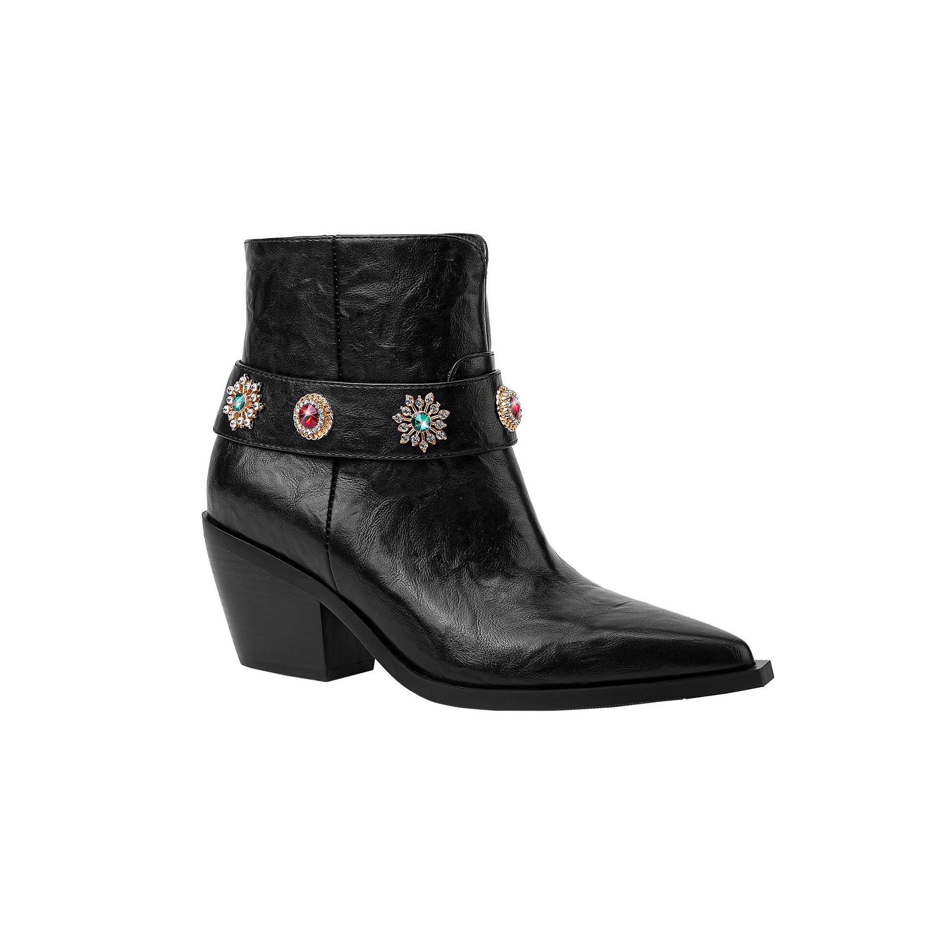 Træd ind i elegancen med vores stilfulde Kvinde Dekorerede Læder-Støvletter. Fremstillet af høj kvalitet læder, udmærker disse støvletter sig ved et unikt, vintage-inspireret design med iøjnefaldende dekorationer, der tilføjer et strejf af glamour til ethvert outfit. Den spidse tåform og den stablede hæl giver en trendy silhuet, perfekt til både afslappede udflugter og formelle begivenheder.