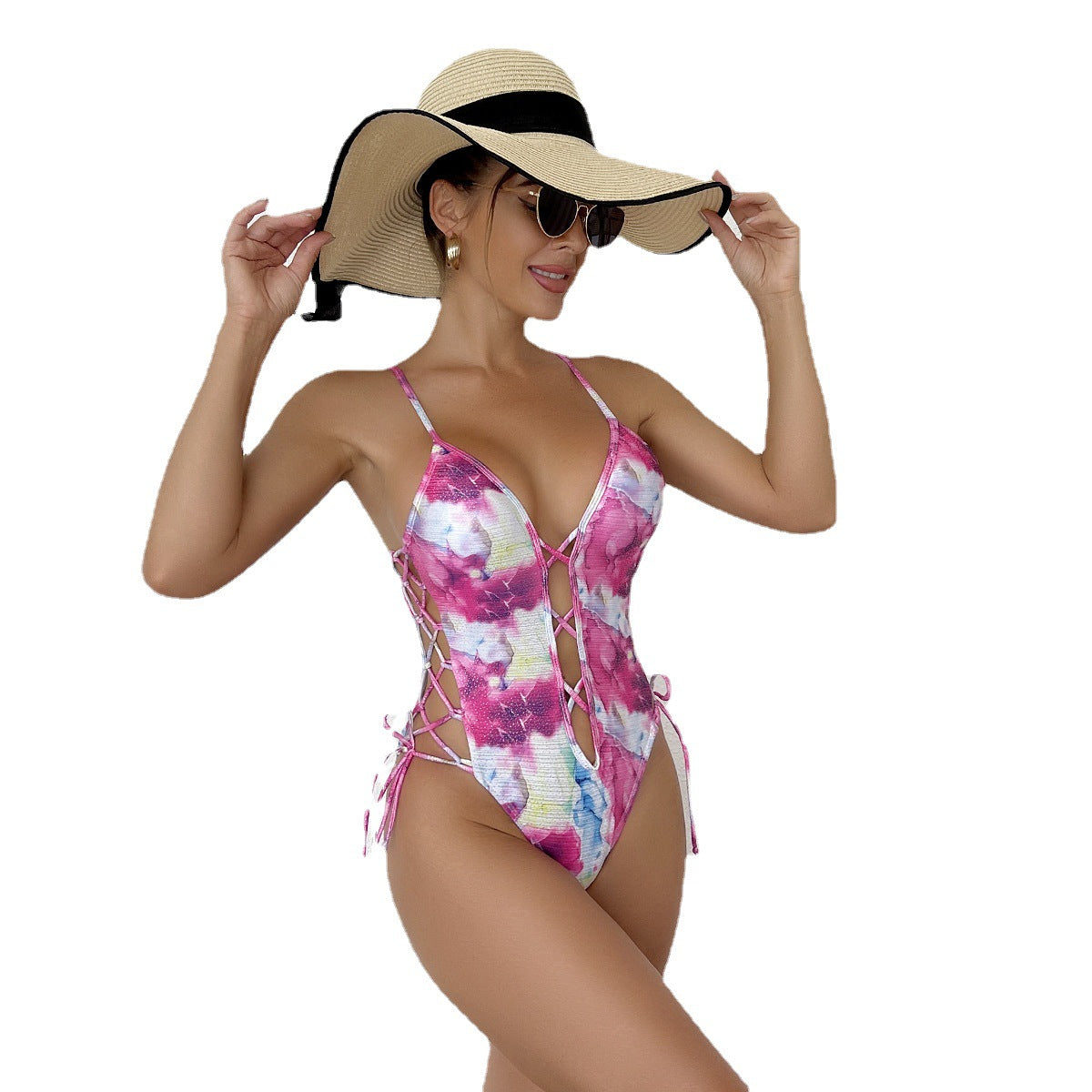 Berig dine badeoplevelser med vores stilfulde og trendy Cut-Out Lace-Up Heldragt Badedragt. Denne badedragt, specielt designet til den moderne kvinde, præsenterer et livligt, floralt batikdesign, der fanger sommerens ånd.
