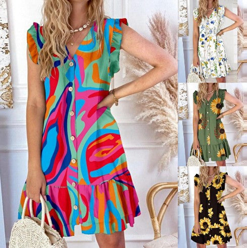 Omfavn uhøjtidelig elegance med vores afslappede kortærmede skjortekjole til damer med flæsekant. Denne kjole er designet til dem, der værdsætter stil og komfort, og er perfekt til en række sommeranledninger.