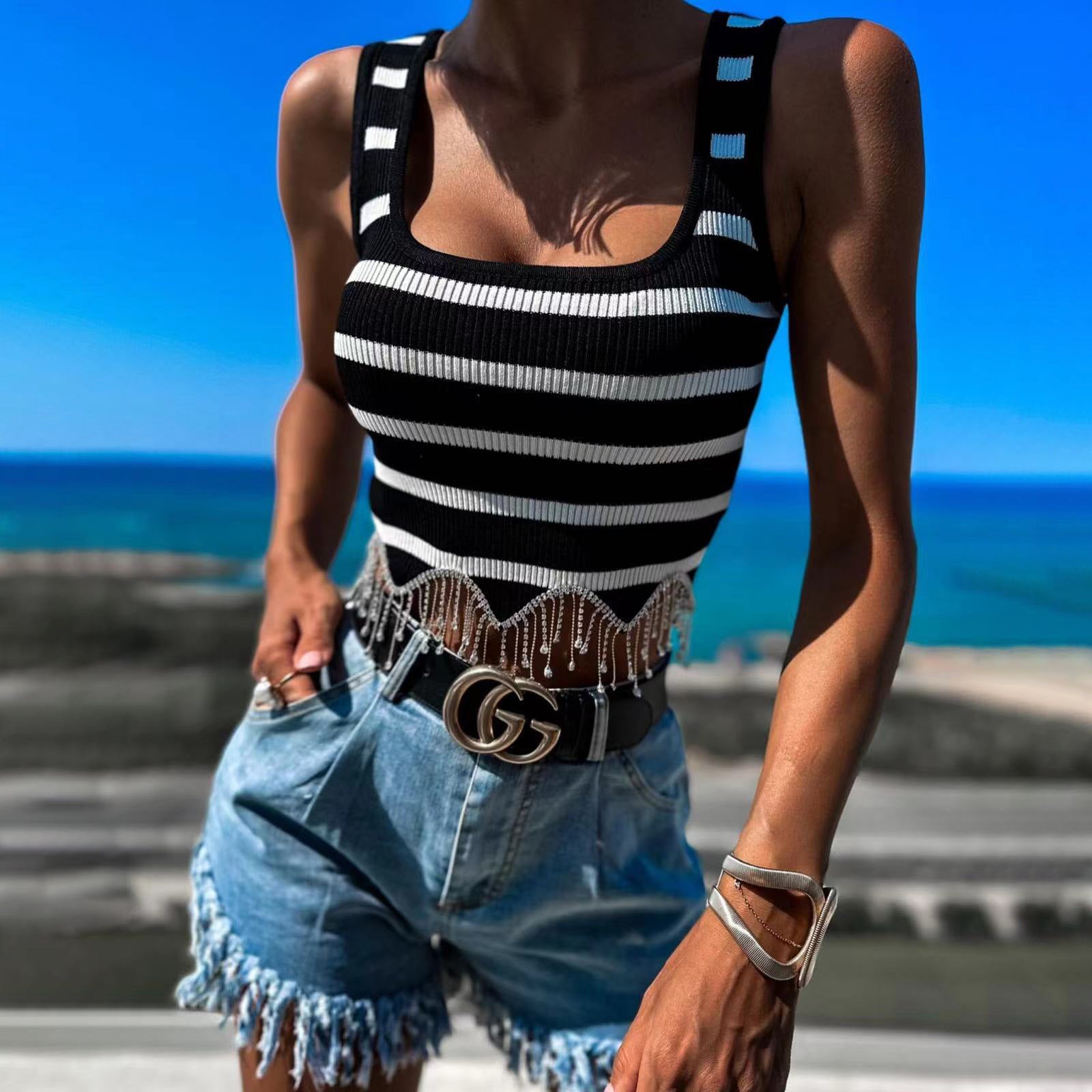 Opdag det unikke dames crop-top med stribemønster og dekorative frynser fra Stilla. Denne fashionable overdel tilbyder ikke kun et trendy look, men også høj komfort til varme dage.