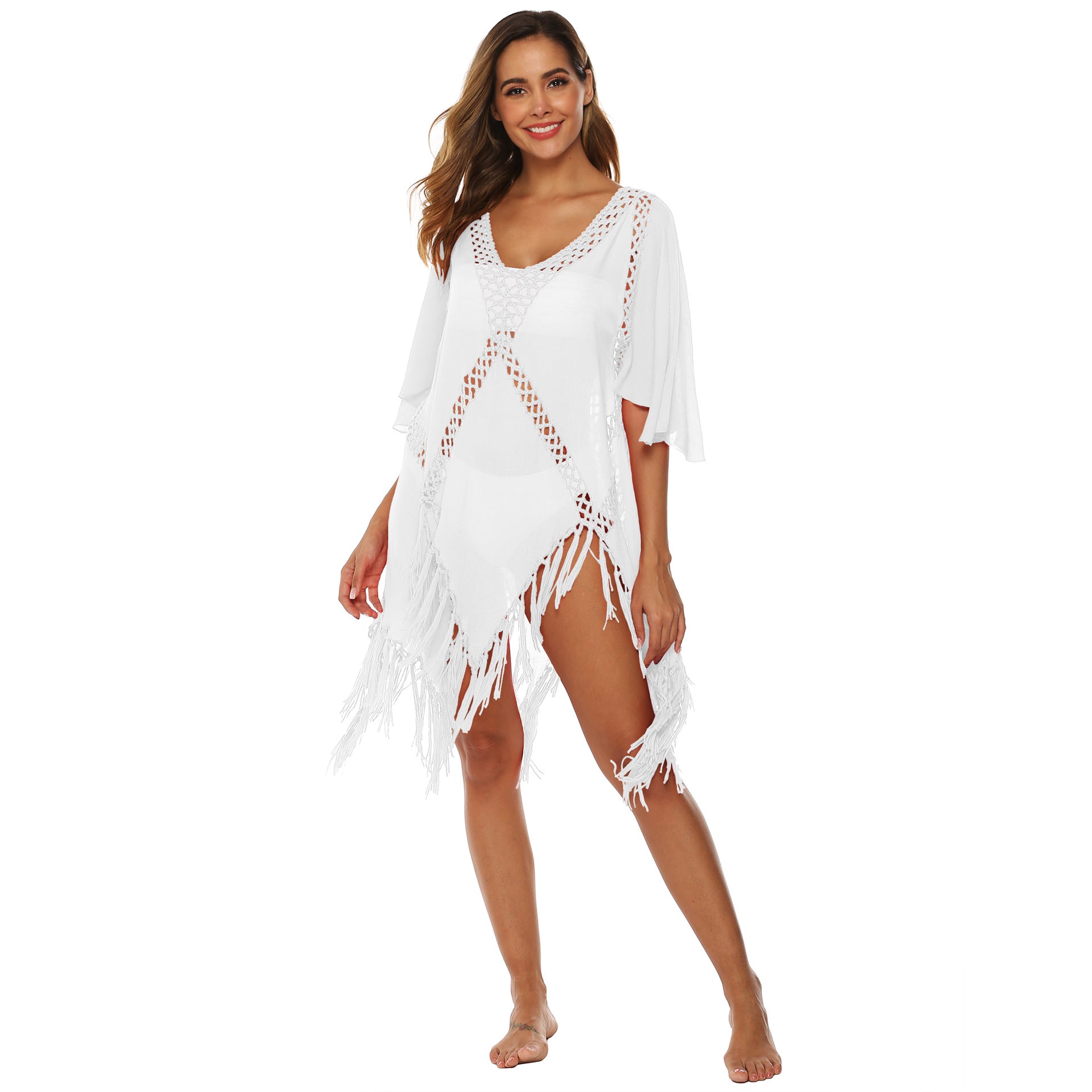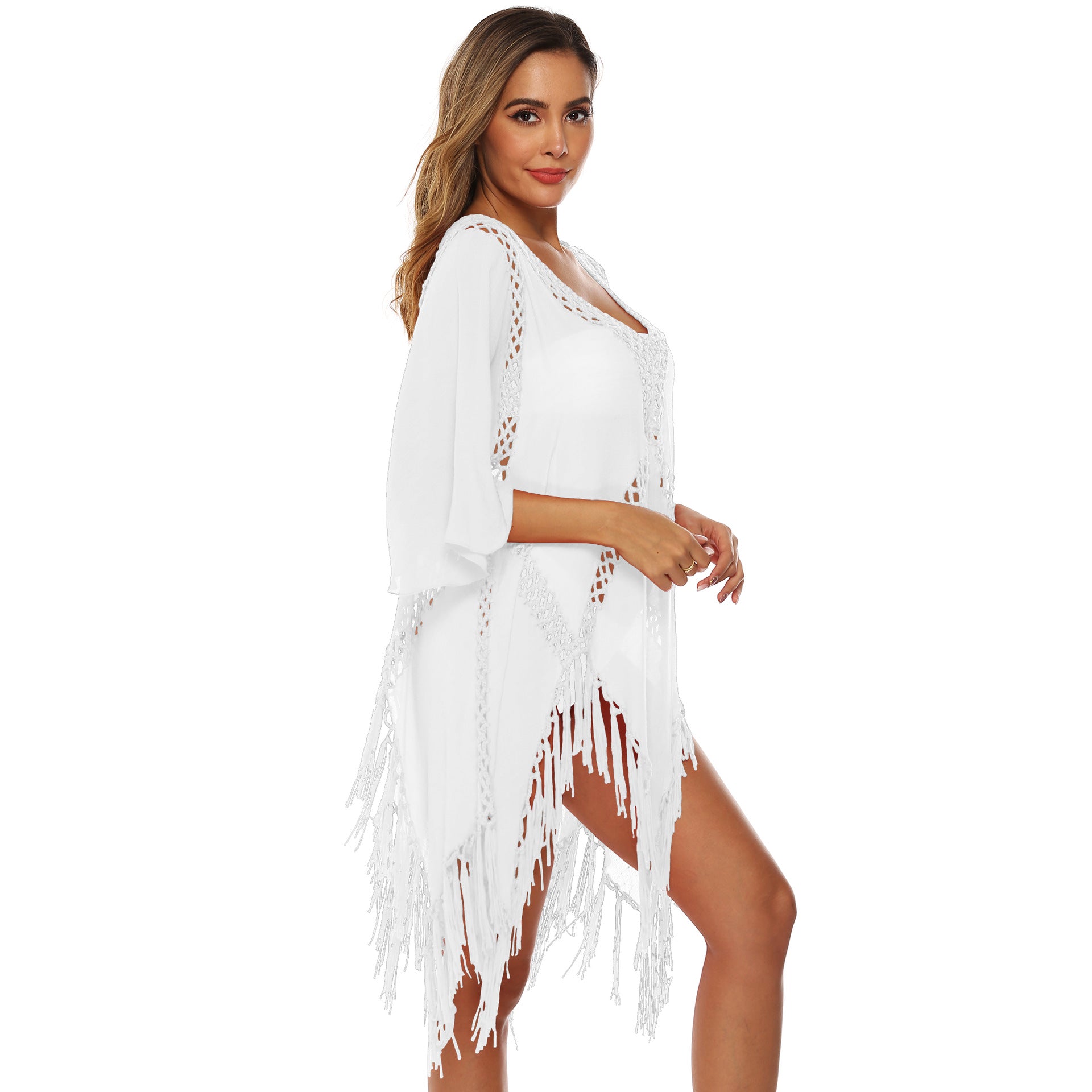 Fremhæv din strandstil med vores elegante frynse-strandovertræk til damer. Designet til komfort og flair, har dette overtræk et åbent design med detaljeret hækling, der giver dit badetøj et strejf af raffinement.