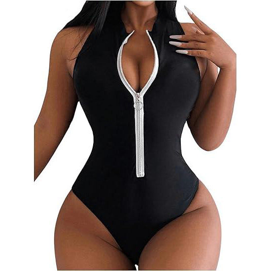 Uanset om du nyder bølgerne eller slapper af ved poolen, er vores dames højskårne lynlås badedragt dit bedste valg for komfort, stil og fleksibilitet.