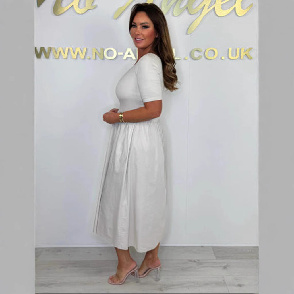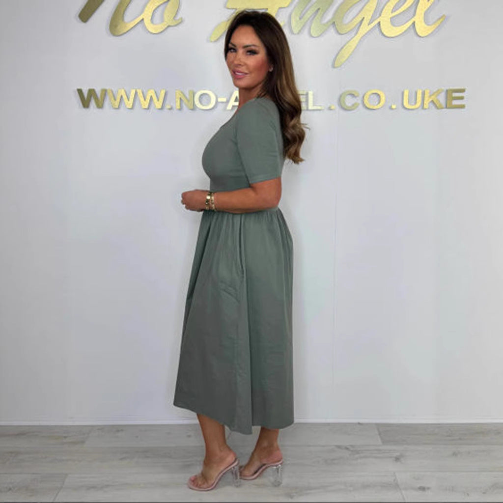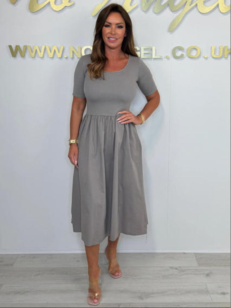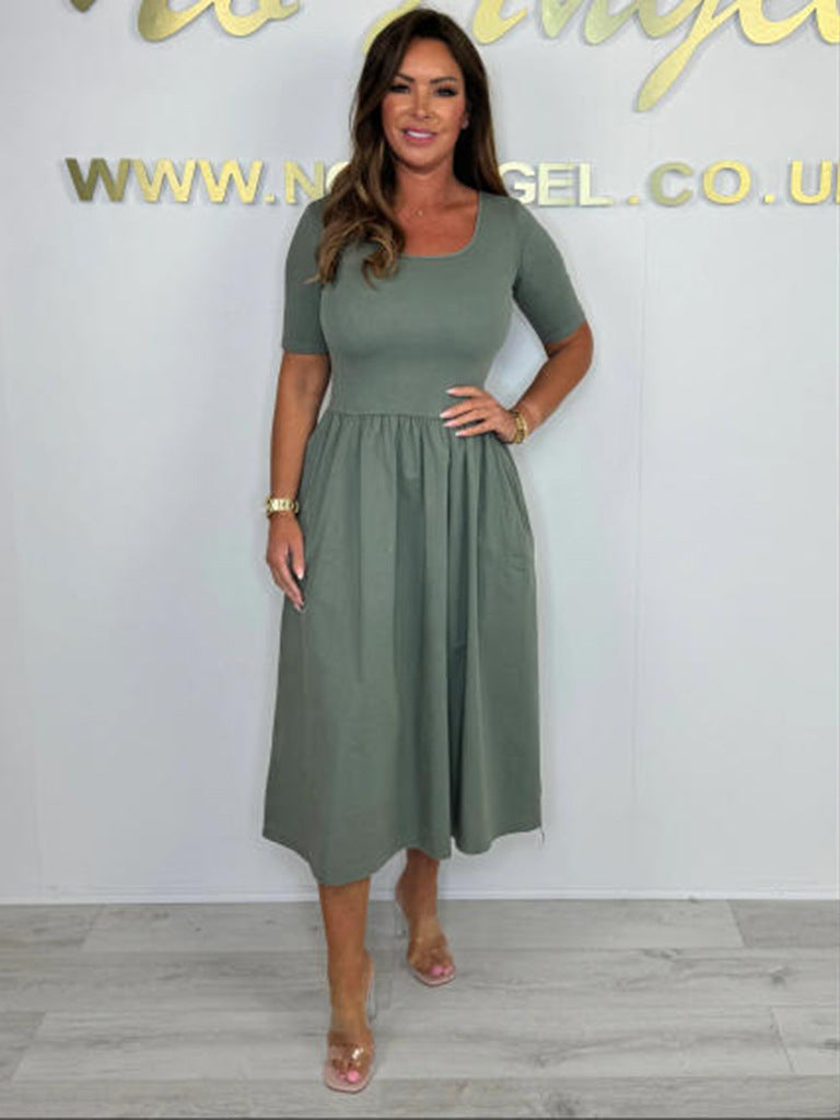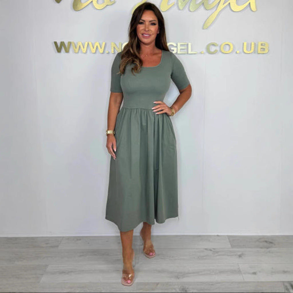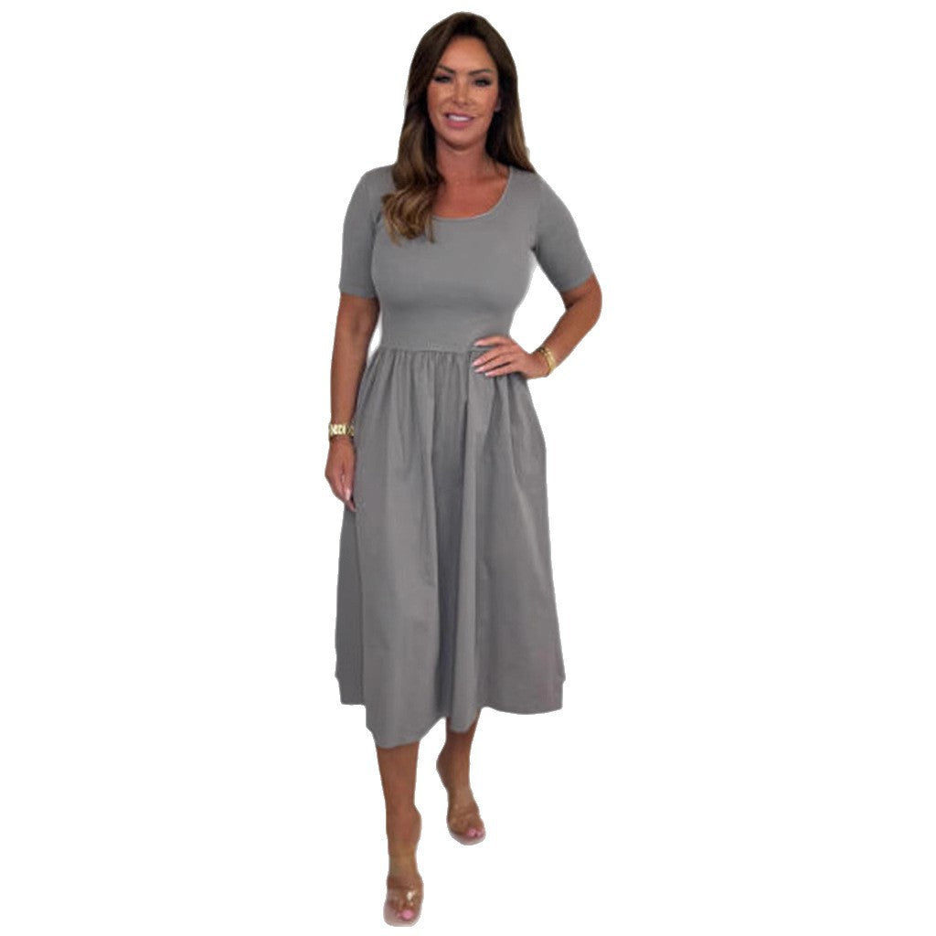 Opdag den perfekte kombination af elegance og komfort med vores A-linje midi kjole til damer med korte ærmer. Denne alsidige kjole har en smigrende A-linje silhuet, der elegant flyder og er ideel til forskellige anledninger, fra afslappede udflugter til særlige begivenheder.