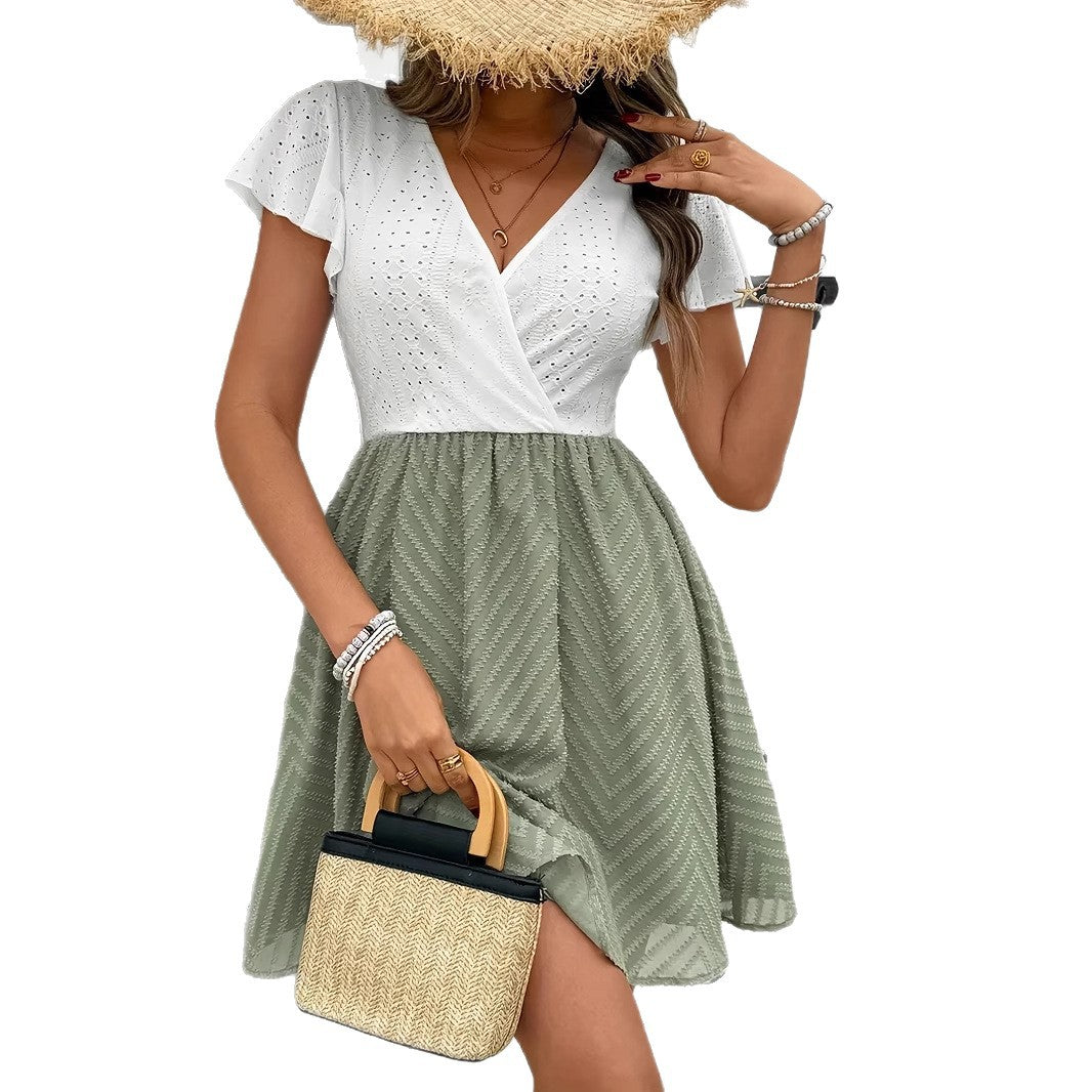 Designet med gennemarbejdede detaljer, viser kjolen charmerende flagermusærmer og en trendy indpakningsudskæring, der giver den et elegant, men afslappet udtryk. Det delikate mønster på overskydet kombinerer sig med en subtilt struktureret nederdel og skaber en legende kontrast, der bidrager til dens visuelle tiltrækningskraft.