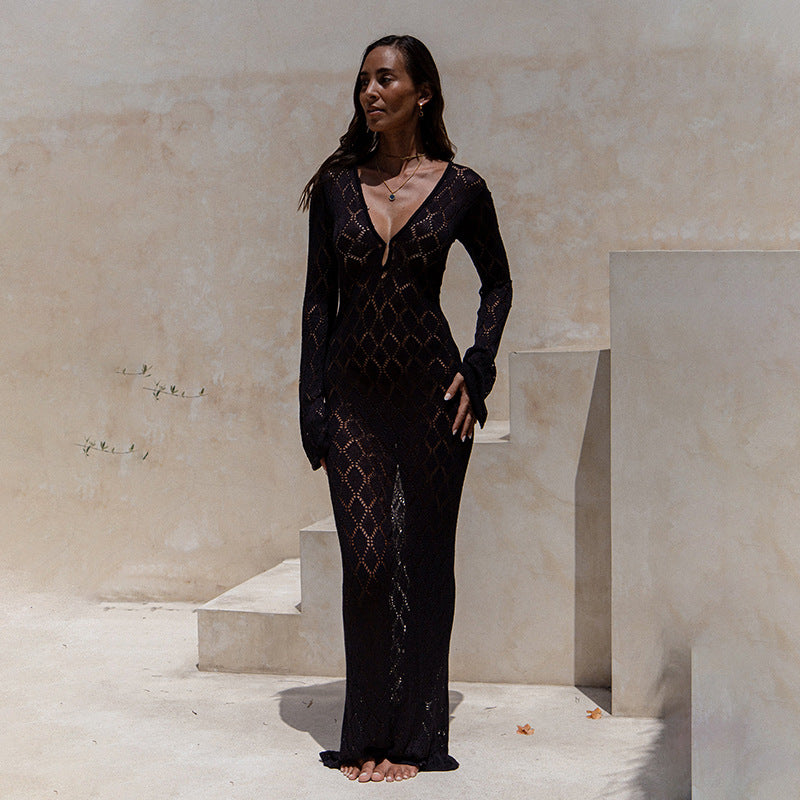 Vi præsenterer vores elegante Åben Strik-Maxi-Kjole til damer, der er perfekt designet til både stil og komfort. Denne betagende kjole har et indviklet åbent strikmønster, der fremhæver din silhuet smukt og samtidig sikrer åndbarhed på varme sommerdage.