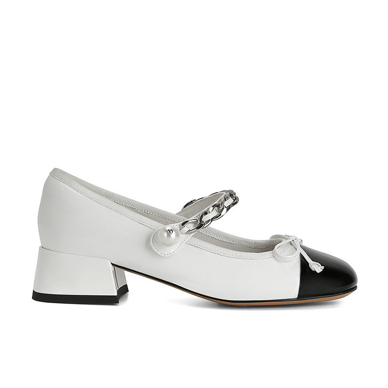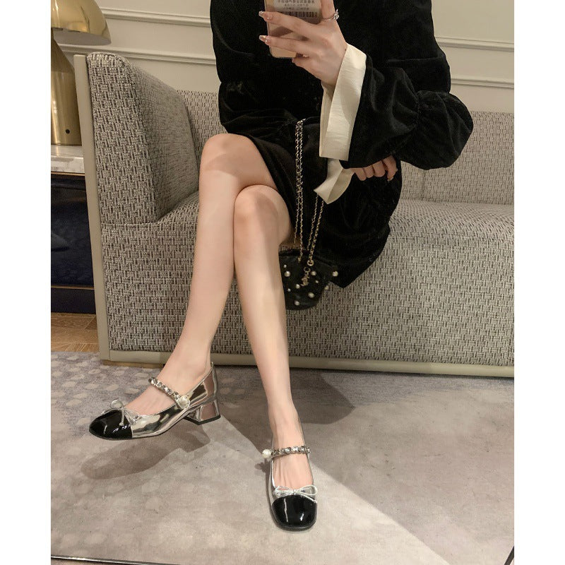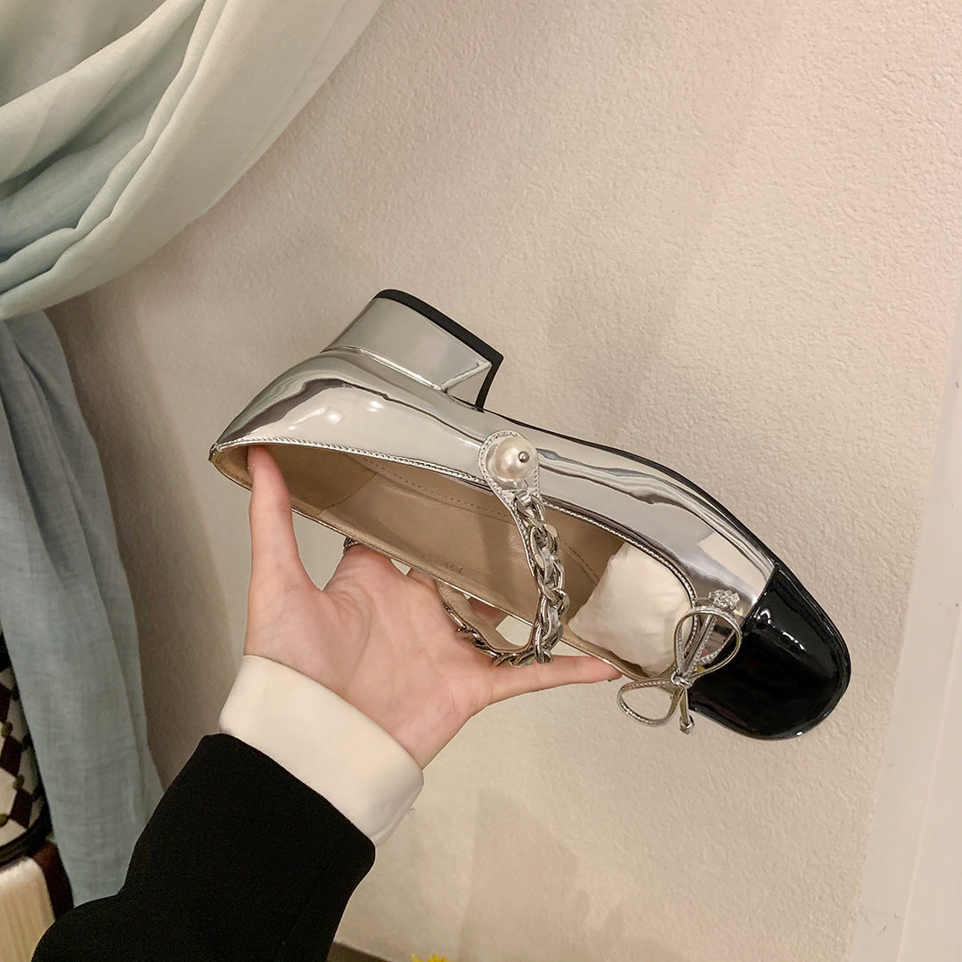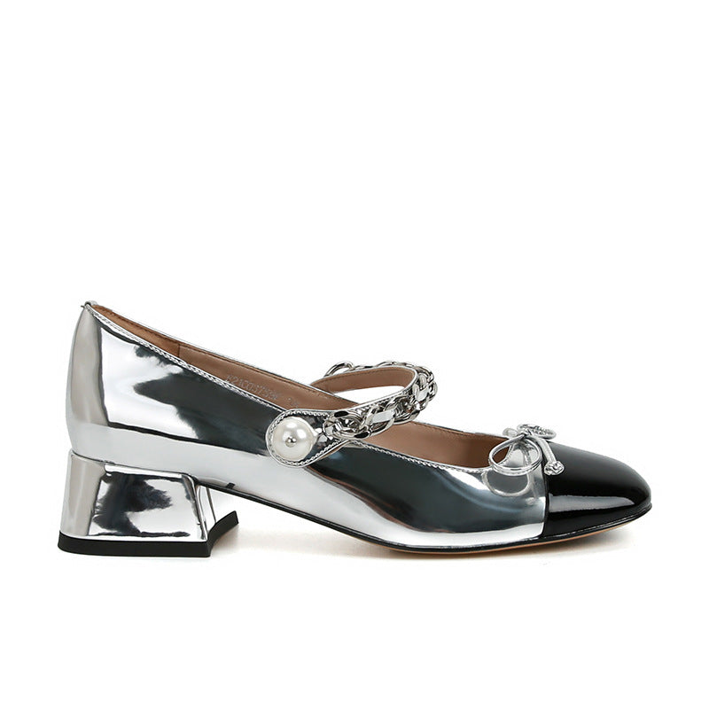 Fremstillet af materialer af høj kvalitet viser disse Mary Jane-sko en smuk blanding af glossy overflader, mens den dekorative kæde tilføjer et strejf af luksus og unikhed. Den afrundede tå og den justerbare rem sikrer en sikker pasform, ideel til daglig brug, uanset om det er på arbejde eller til en særlig begivenhed.