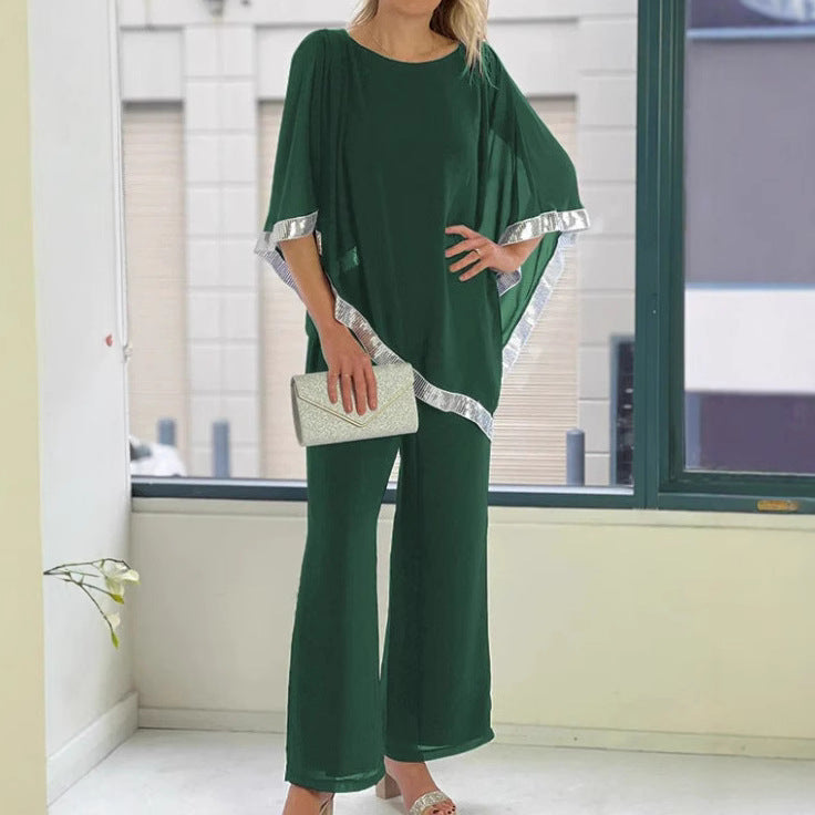 Træd ind i elegance med vores Dame Elegant Chiffon To-delt Stilla, designet til dem, der værdsætter en kombination af komfort og stil. Dette fortryllende outfit er præget af en flydende chiffon-overdel med eksklusive sølvdetaljer, perfekt kombineret med et bredt par bukser, der giver en luksuriøs silhuet.