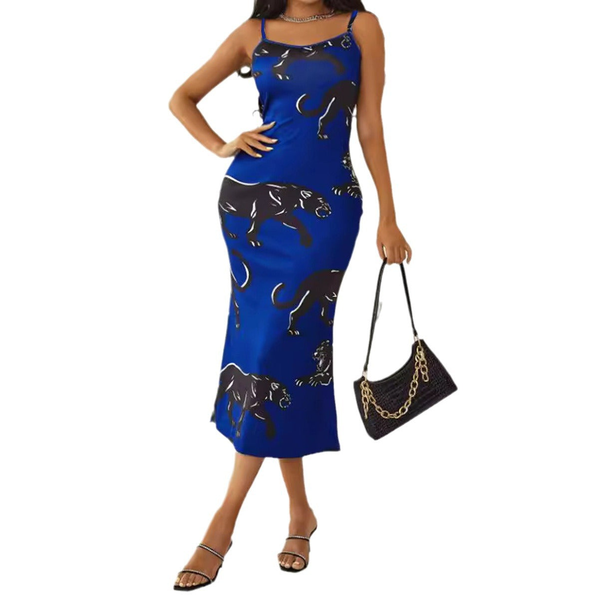 Træd stilfuldt ind med vores elegante midi-kjole med dyreprint, som er designet til den moderne kvinde, der kan lide at skille sig ud. Denne iøjnefaldende kjole har en livlig blå baggrund, der er pyntet med dristige dyresilhuetter, perfekt til at gøre et statement ved enhver lejlighed.