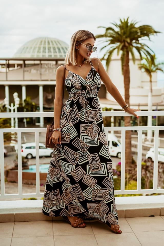 Omfavn et elegant look med vores stilfulde dames maxikjole med geometrisk tryk. Denne fantastiske kjole har et trendy geometrisk design, der legemliggør moderne elegance og gør den perfekt til forskellige anledninger. Det lette stof sikrer komfort og udstråler stil, så du kan bevæge dig frit.