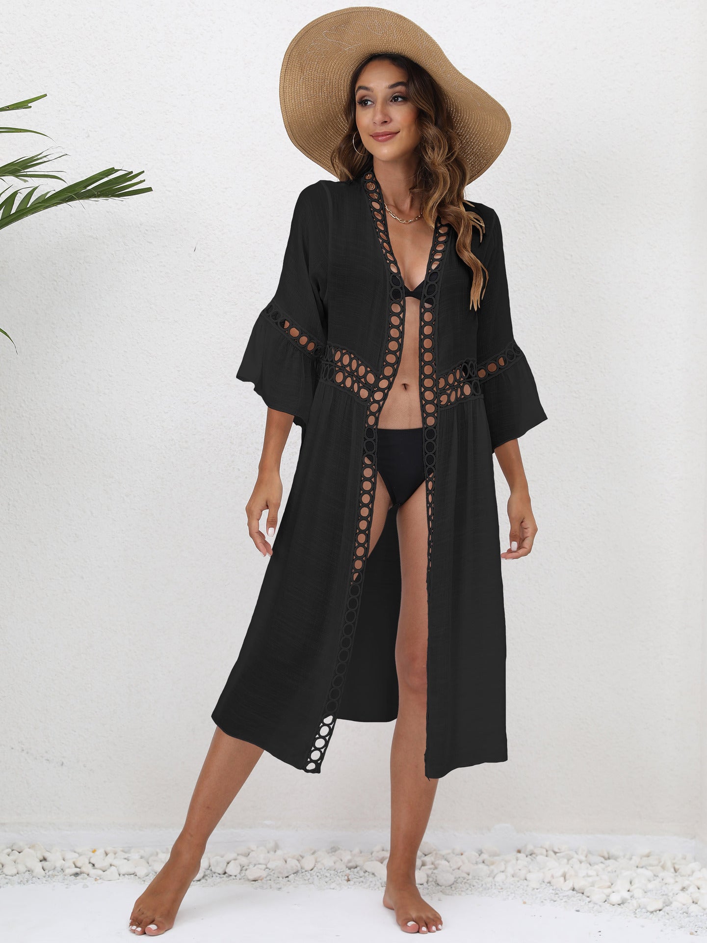 Vi præsenterer vores elegante cover-up-robe til damer med hæklede detaljer fra Stilla, designet til den stilfulde strandgæst, der værdsætter både stil og komfort. Denne eksklusive cover-up tilbyder prangende hækledekorationer, der tilføjer et strejf af raffinement til dit strandoutfit.