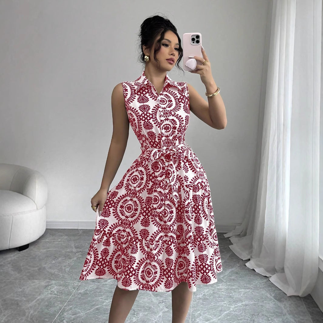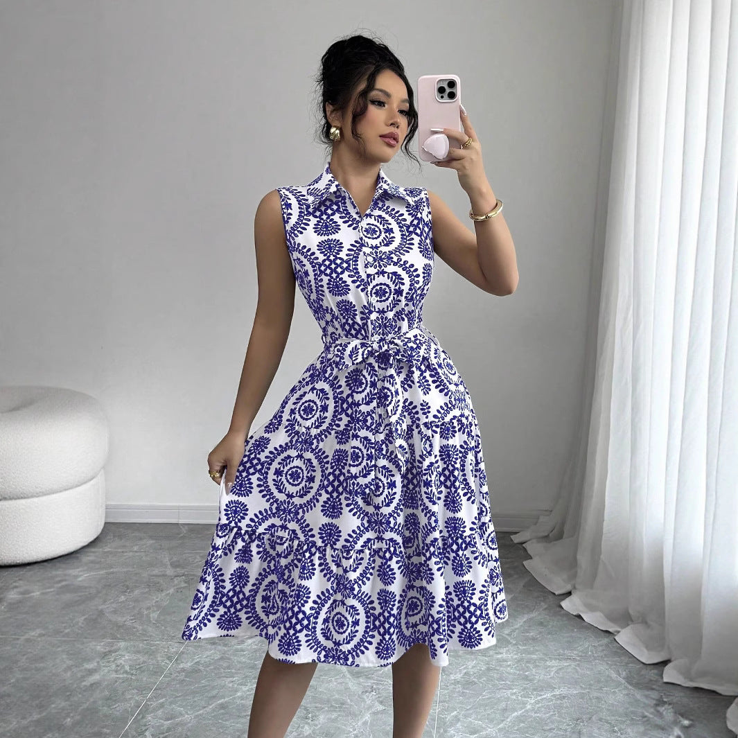 Det ærmeløse design og den klassiske krave skaber en flatterende silhuet og gør den til det ideelle valg til varme dage. Det taljebælte fremhæver ikke kun din figur, men giver også en justerbar pasform, der sikrer maksimal komfort hele dagen. Uanset om det kombineres med sandaler til en daglook eller med hæle til en aftenbegivenhed, er denne kjole alsidig og stilfuld.