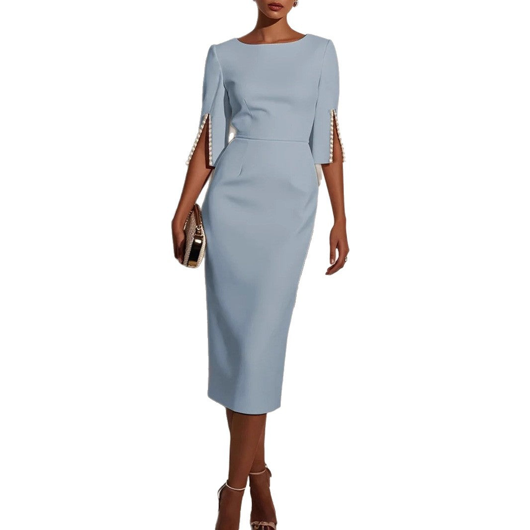 Denne elegante sheath-kjole til kvinder er det perfekte valg til finere begivenheder eller formelle sammenkomster. Fremstillet af kvalitetsmateriale, har den fantastiske perlebesatte ærmer, der giver den klassiske silhuet et strejf af glamour.