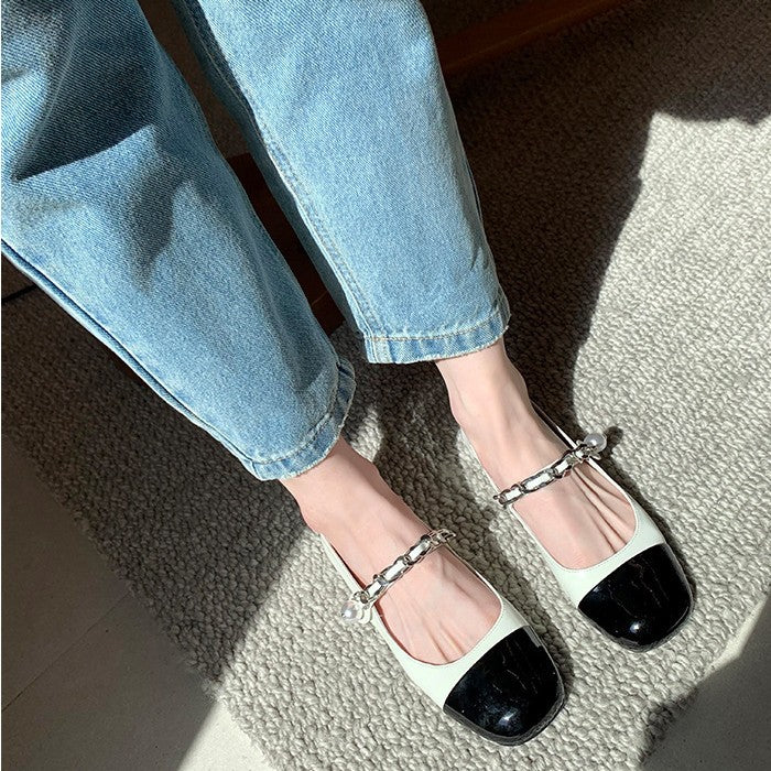 Træd ind i raffinementets verden med vores elegante Mary Jane Flats med blokhæl og dekorativ kædedetalje fra Stilla. Disse flats kombinerer klassisk design med moderne accenter, perfekt til formelle og afslappede anledninger.