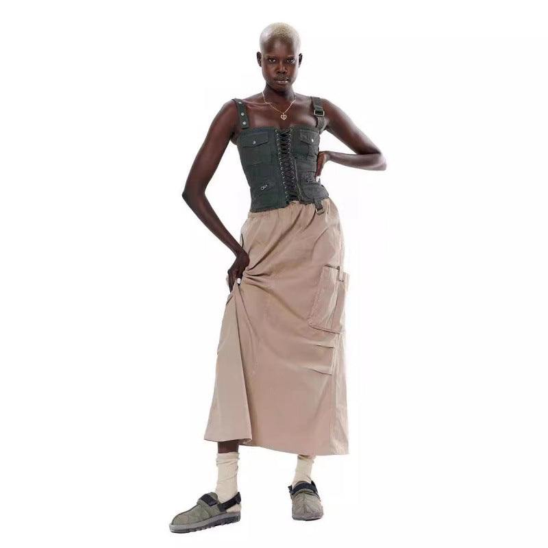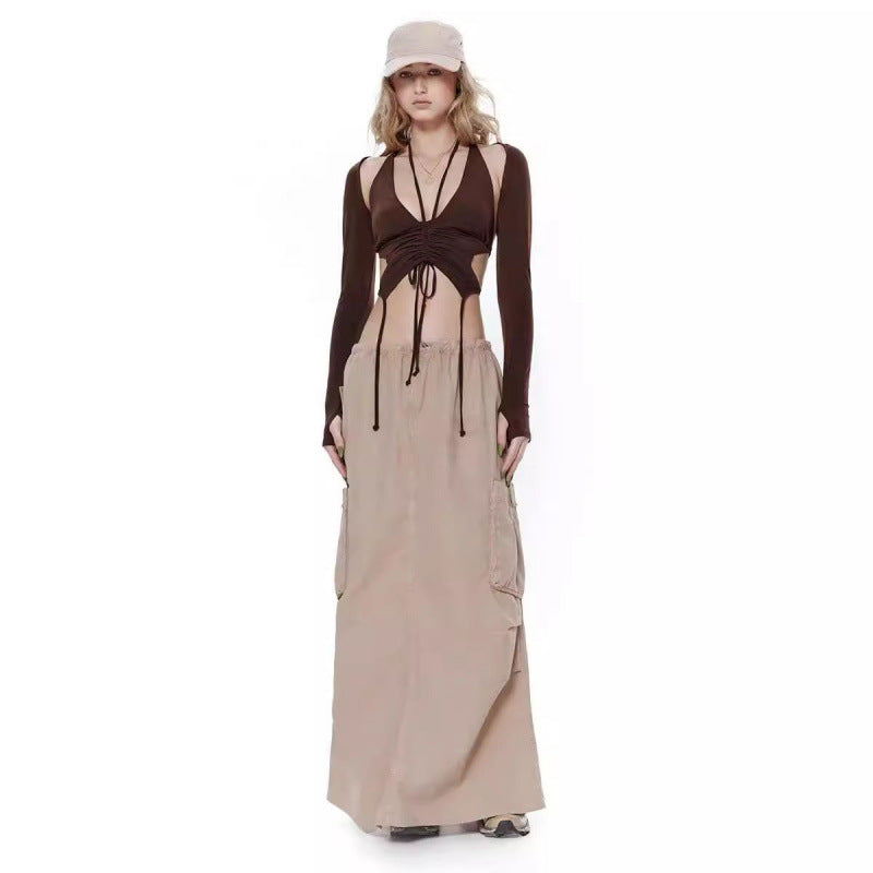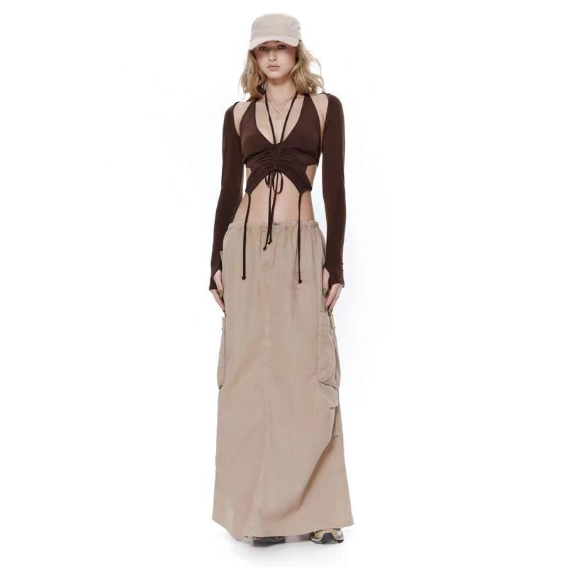 Forbedr dit modebevidste med denne stilige, forkortede langærmede top til damer, der kombineres med en alsidig cargo-maxikjole. Designet til dem, der værdsætter både stil og funktionalitet, forener dette outfit problemfrit nutidige trends med funktionelle elementer.