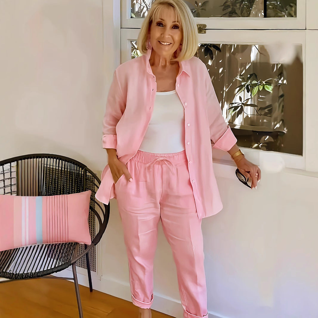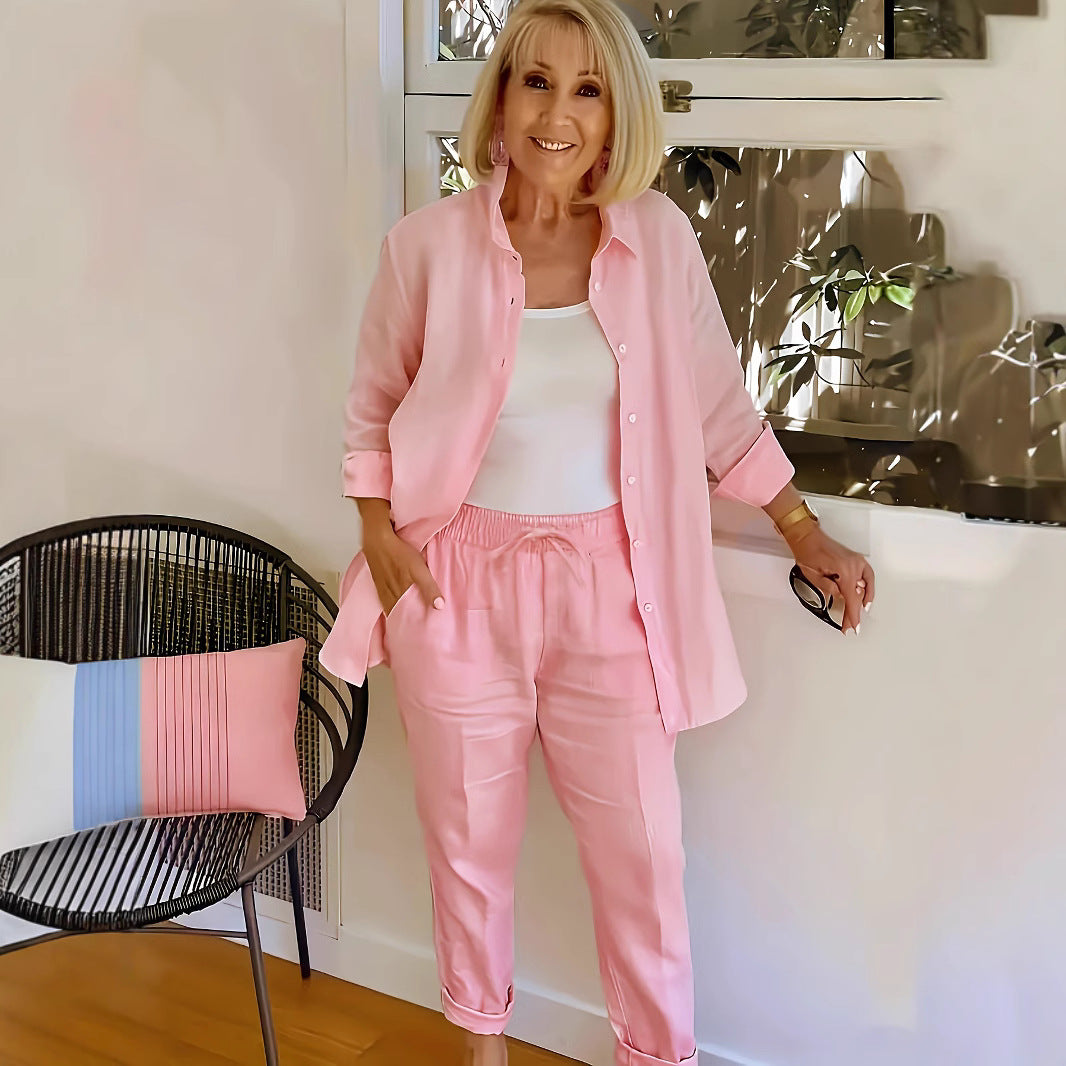 Opdag den ultimative komfort med vores Women's Relaxed Fit Linen Lounge Set Stilla. Perfekt til afslapning derhjemme eller afslappede udflugter, består dette åndbare og lette sæt af to dele: en skjorte med knaplukning og et par bukser med elastisk talje, som er lavet af kvalitetslinned.