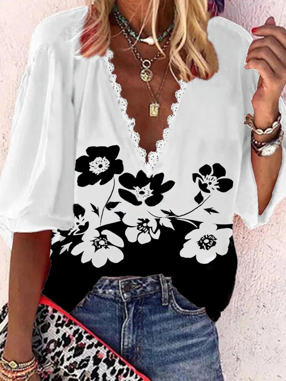 Stilla | Damebluser Løse Trykte Blonder V-hals Mellemlange Ærmer Bluse
