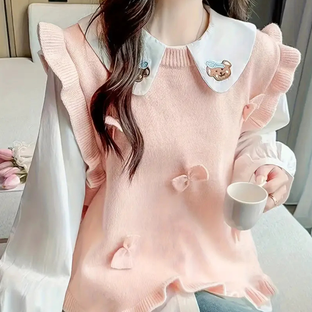 Den Stilla Udenærmet Strikvest med Sløjfe til Damer er et modebevidst valg med et delikat sløjfedetalje, perfekt til at opgradere ethvert look.